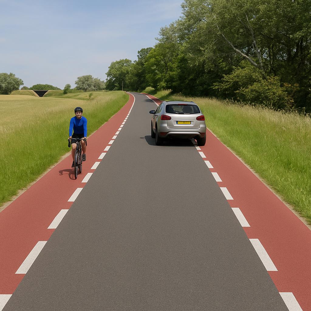 • Er komen twee rode stroken aan beide zijkanten voor fietsers/voetgangers met in het midden 1 grijze rijstrook voor gemotoriseerd verkeer.