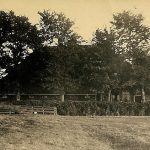 achtergrond de nieuwbouw woningen. Een gedeelte van het hek wat zichtbaar is loopt vanaf het kerkhof naar het Middelpad. Het land tussen het hek en de