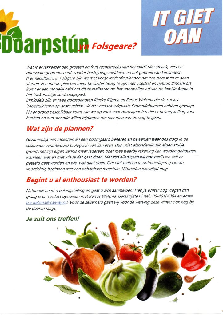 Jaarlijkse ledenvergadering: Onze jaarlijkse ledenvergadering wordt gehouden op vrijdag 22 maart a.s. in het dorpshuis. Het gaat om een ledenvergadering, maar niet-leden uit Folsgeare of Tsjalhuzum zijn ook van harte welkom. Na de vaste agendapunten is er een presentatie van onze toekomstige dorpstuin: Abma’s Pleats.