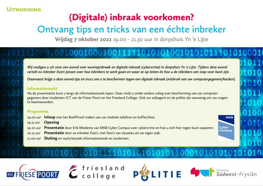 Preventieavond: Vrijdag 7 oktober a.s. staat Folsgeare in het teken van inbraakpreventie en cyberpreventie. Hoe inbraakgevoelig is mijn woning? Valt mijn wifi te kraken? ’s Avonds wordt in het dorpshuis de balans opgemaakt hoe het met inbraak- en cyberpreventie gesteld is in Folsgeare. Er is inmiddels een uitgebreide flyer huis aan huis bezorgd. De flyer is ook te vinden op onze website en Facebook.